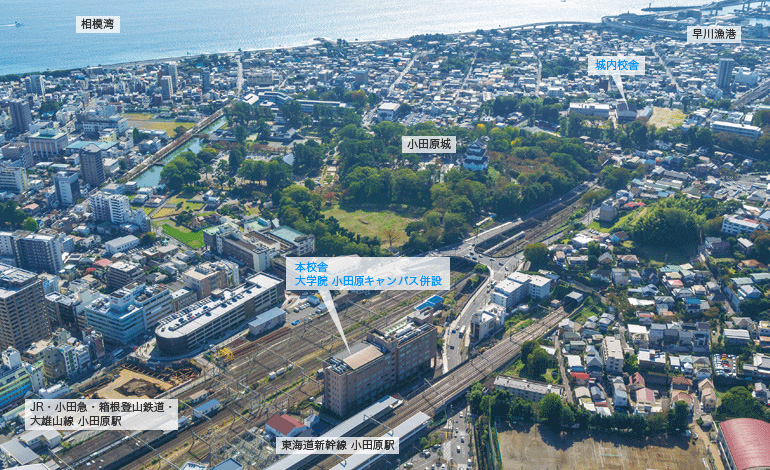 小田原キャンパスは、本校舎に加え2016年3月に城内校舎が完成し、学修環境がさらに充実しました。本校舎はJR・私鉄の5路線が乗り入れる「小田原」駅に隣接し、城内校舎は本校舎から徒歩8分の場所にある都市型キャンパスです。交通の便が良いことから、学生も広範囲から通学しています。キャンパス周辺には長い歴史と伝統を持つ小田原の街並みや小田原城、相模湾など風光明媚な環境が広がっています。