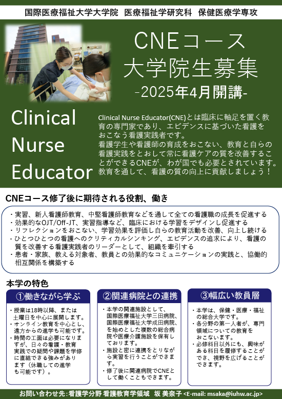Clinical Nurse Educator(CNE)とは臨床に軸足を置く教育の専門家であり、エビデンスに基づいた看護をおこなう看護実践者です。看護学生や看護師など看護に関連するすべての人が対象であり、さまざまな学習理論や研究成果をもとに育成をおこないます。また、教育と自らの看護実践をとおして、常に看護ケアの質を改善もおこないます。近年、臨床現場にて教育の専門家としてCNEがわが国でも必要とされています。