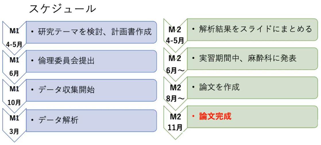 主に周手術期に関する臨床研究を行います。そのため、計画書の立案、統計解析ソフトの使い方・データの読み方、論文の書き方まで指導教員と一緒に行います。2年間の研究成果については、修了後も指導教員がサポートし、英論文投稿を目指すことも可能です。