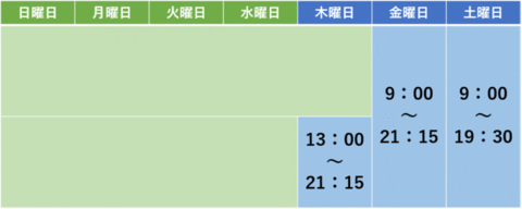 1年次の授業(青色の部分)は、毎週木金土で構成されており、それ以外は働くことが可能です。 2年次は長期間の実習があるため、下記のカリキュラムとは異なります。