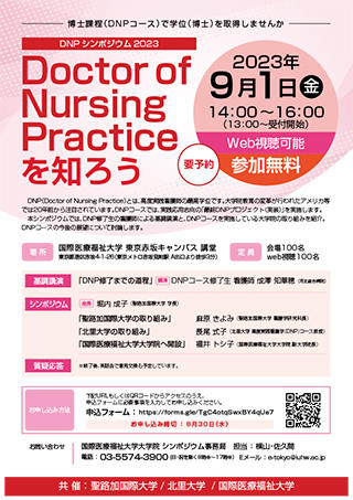 2023年9月1日(金)に国際医療福祉大学、聖路加国際大学、北里大学の共催で、DNPシンポジウム2023「Doctor of Nursing Practiceを知ろう」を開催します。