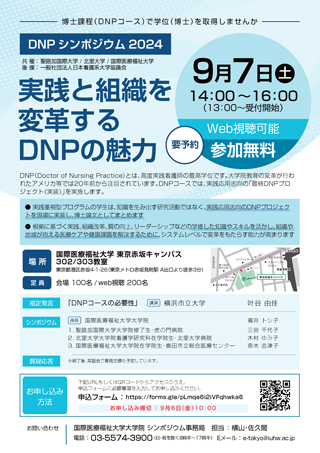 2024年9月7日(土)に国際医療福祉大学、聖路加国際大学、北里大学の共催で、DNPシンポジウム2024「実践と組織を変革するDNPの魅力」を開催します。