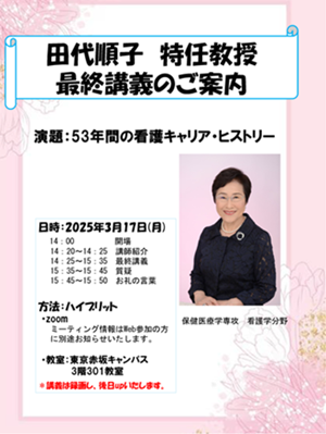 【3/17(月)開催】田代順子 特任教授 最終講義「53年間の看護キャリア・ヒストリー」のご案内