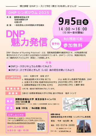 2025年9月5日(金)に国際医療福祉大学、聖路加国際大学、北里大学の共催で、DNPシンポジウム2025「DNP魅力発信」を開催します。