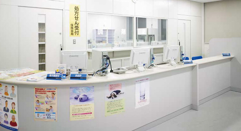 薬学棟3階は、全フロアが実習施設。調剤室や無菌製剤室など各種調剤室や診察室はもちろん、実際の保険薬局を模した設備もあります。待合室もある受付カウンターで、対面での処方せんの受付から診療報酬の請求、服薬指導などを演習することができ、臨床薬学教育を重視した充実の設備となっています。(大田原キャンパス/薬学科)