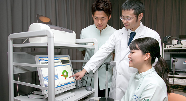 言語聴覚士は「ことば」や「聞こえ」の障害、摂食・嚥下(飲み込み)の障害を持つ方に、評価や訓練、指導などを行う医療専門職です。その演習室は、1,600m2のフロアに16室にもおよぶ最新の演習施設を整備しています。広さ、演習室数とも、言語聴覚士養成校としてはこれまでにない規模を誇ります。(大川キャンパス/言語聴覚学科)