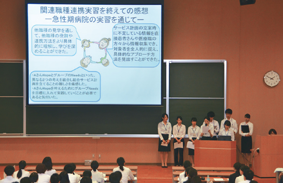 最終ステップとなる「関連職種連携実習」では、病院や福祉施設で実際の患者さんや利用者の方に対する治療計画の立案に関わります。医師や各職種が集うカンファレンスにも参加し、実例に基づいた「チーム医療・チームケア」を体験します。