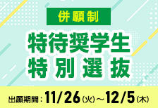 【特待奨学生特別選抜】出願締切12月5日(木)[消印有効]。特待Sは授業料100%相当額を給付。
