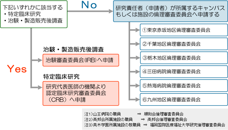 治験・製造販売後調査は治験審査委員会が審査します。その他の研究については、研究代表者の主たる所属先のキャンパスもしくは施設の倫理審査委員会が審査を行います。以下の図を参照し、申請を行う倫理委員会を選択して下さい。