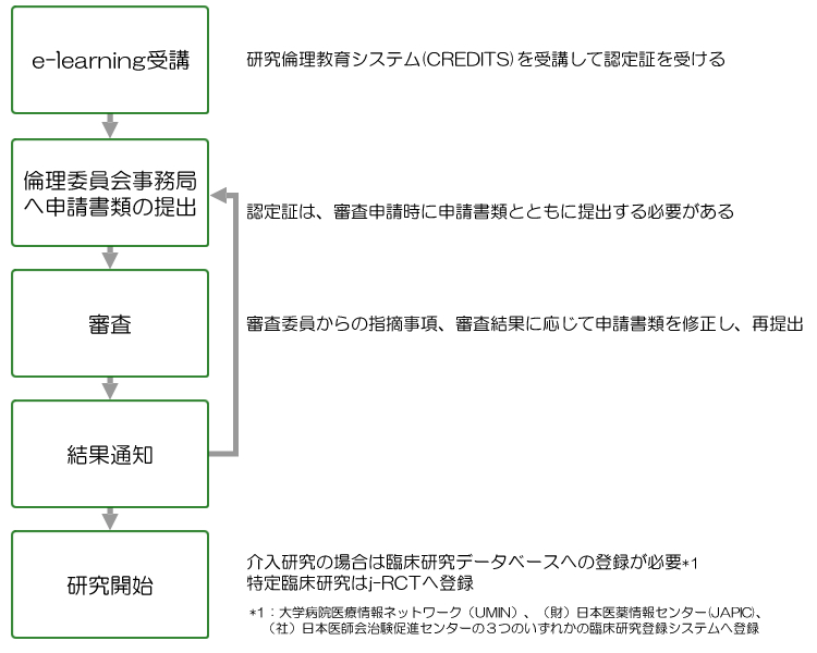 倫理審査から審査結果の通知までに通常1か月程度かかります。また、倫理委員会の開催時期や申請書類の締め切りは、倫理委員会ごとに期日が定められています。計画的な準備と指定期日の遵守をお願いいたします。