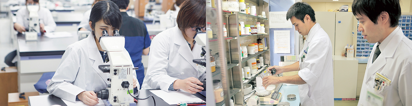 製薬会社での薬の研究・開発・製造から、病院・薬局などでの調剤・服薬指導まで、さまざまな場面で薬に関わります。また、専門知識を生かして、行政機関で医薬品等の製造・販売業の許認可や土壌・水質、薬品、有害・有毒物質の検査などに従事したり、食品・化粧品メーカーの開発部門で活躍したりしています。