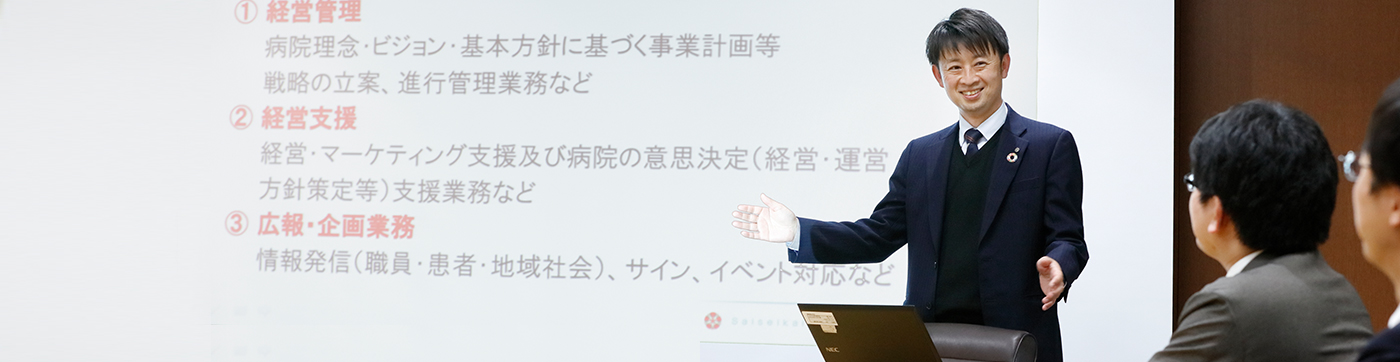 病院の管理部門(経営・企画・財務・医事・人事など)に勤務し、組織を運営します。多くの関連法規や医療機関に特有な事務などに精通して、経営戦略の立案、事業計画の策定、業務改善の提案、財務会計の見直し、在庫管理の強化、組織の活性化、人材育成など、病院経営の基盤を支え、経営の安定や収益向上などを担います。